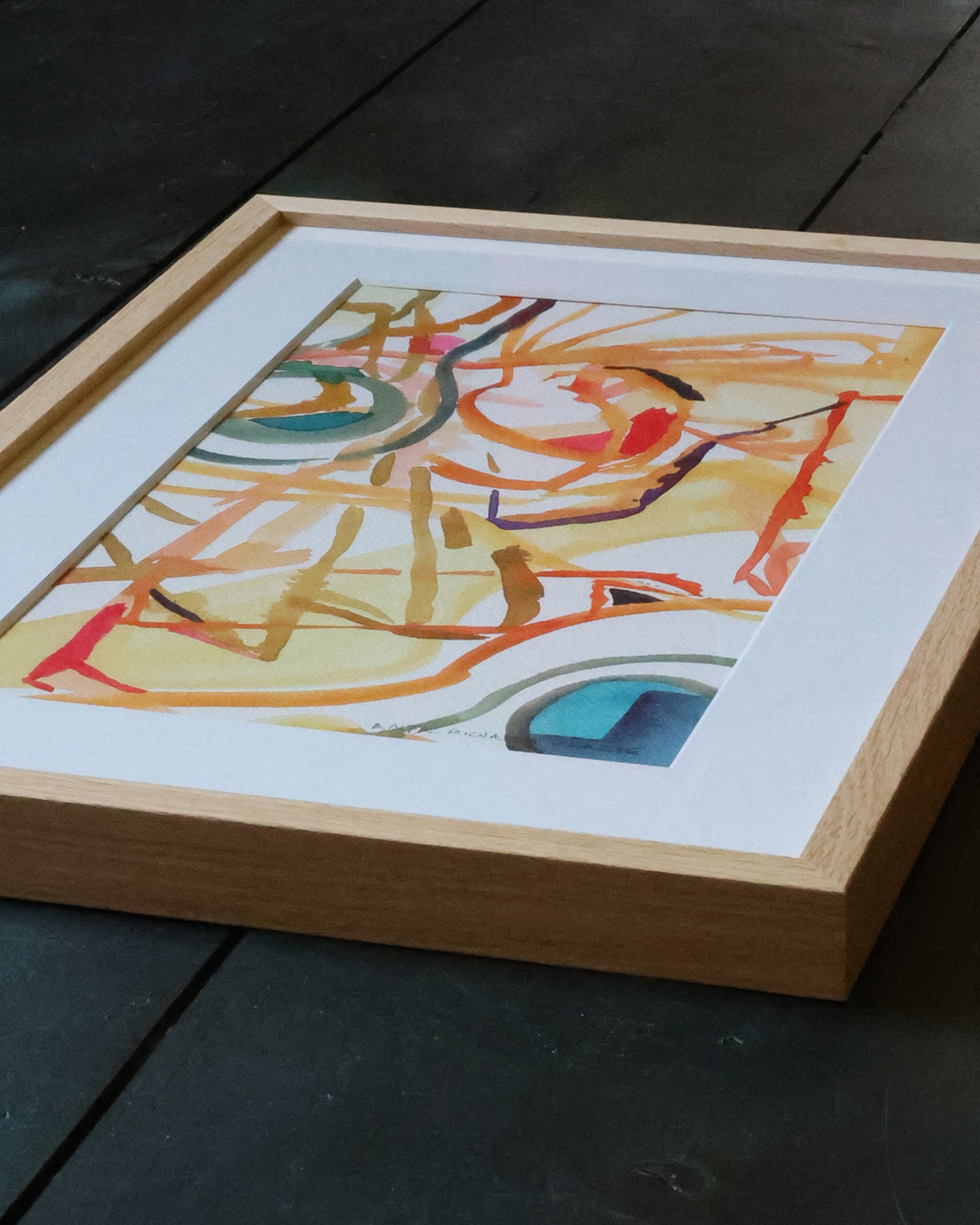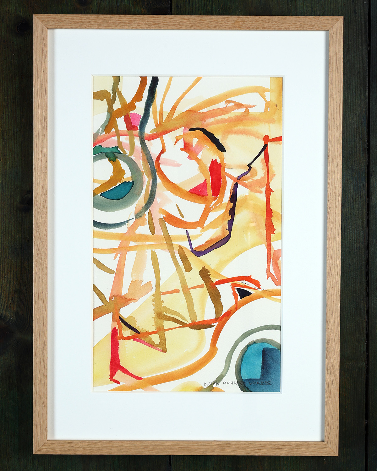 Original skitse fra arbejdet med kunstværk til Nobel diplomet 2023, indrammet i eg med passepartout. Format 19,4x33cm (29,7×42 cm med passepartout).