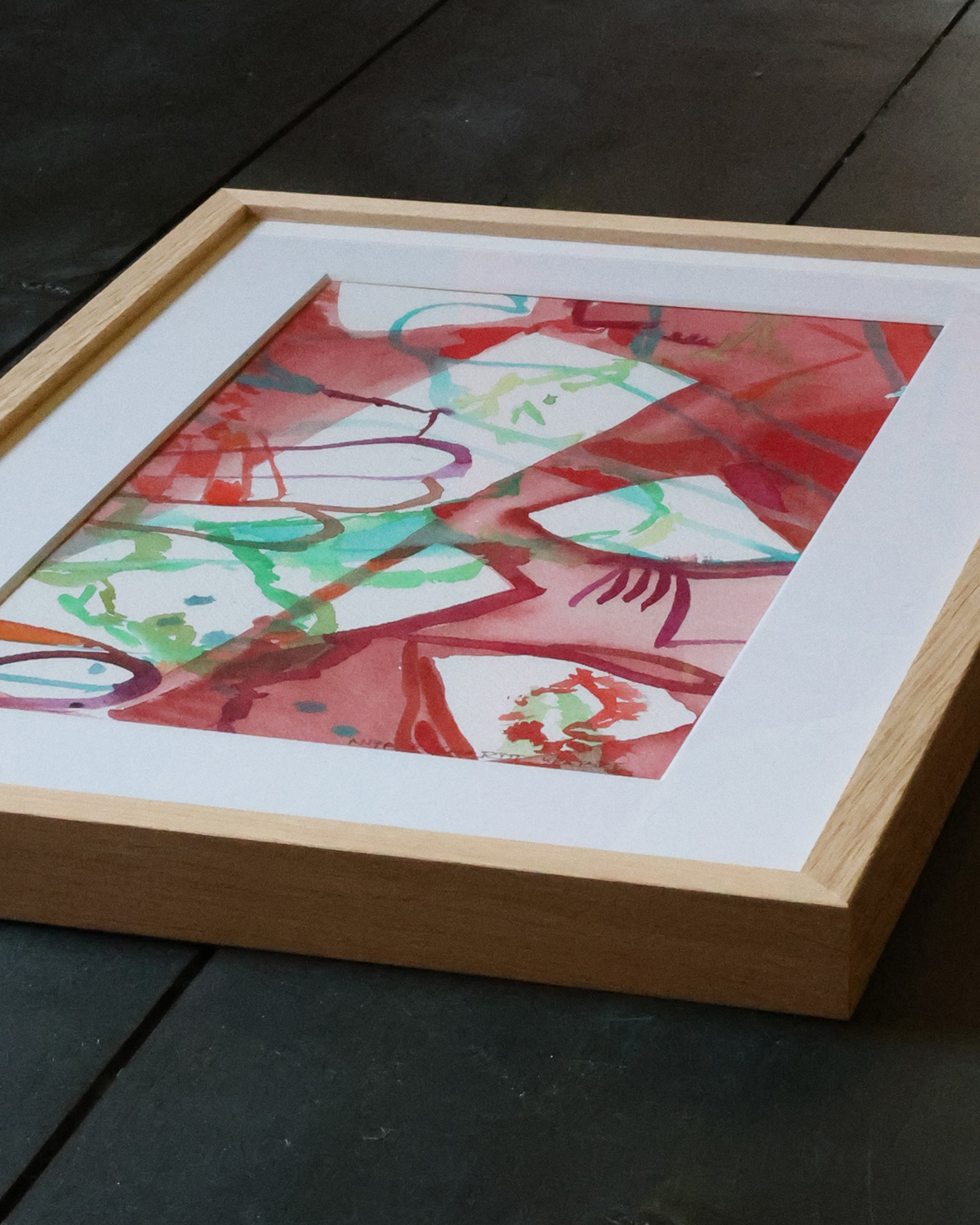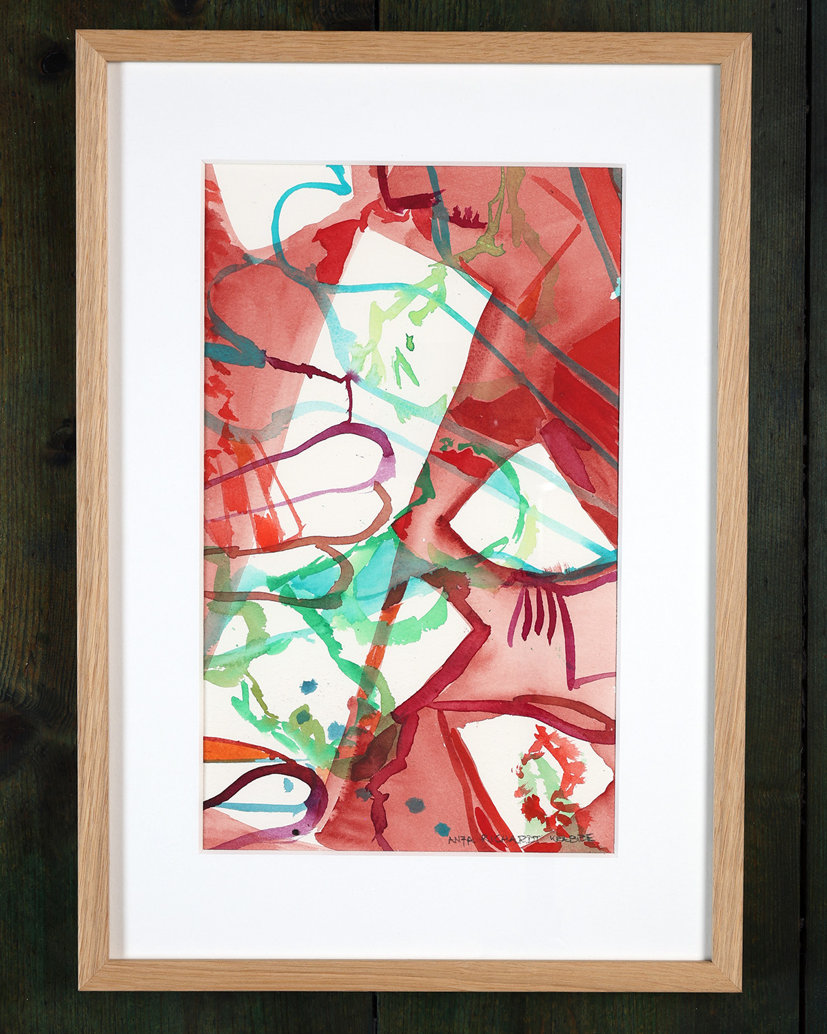 Original skitse fra arbejdet med kunstværk til Nobel diplomet 2023, indrammet i eg med passepartout. Format 19,4x33cm (29,7×42 cm med passepartout).